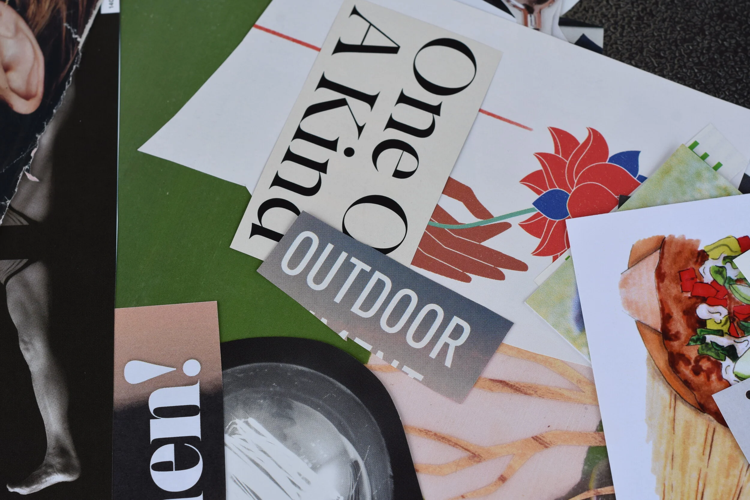3) When you feel as though you have the right images, start arranging them on your sheet of paper. You may want to decide if you are going to make it portrait or landscape. I start by laying out the pieces before gluing them down. It’s way easier to move the around before they’re completely stuck to the paper. Working in layers is another technique because you will need to glue the pieces down from background to foreground, so I usually make sure I have some type of background image and then add layers on top as I go.